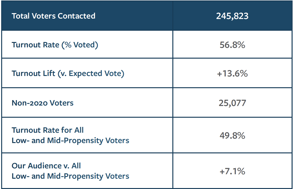 In total, 245,823 voters were targeted. Of those who were targeted, 56.8% of them voted in the 2024 general election, which was a rate 13.6% higher than projected.